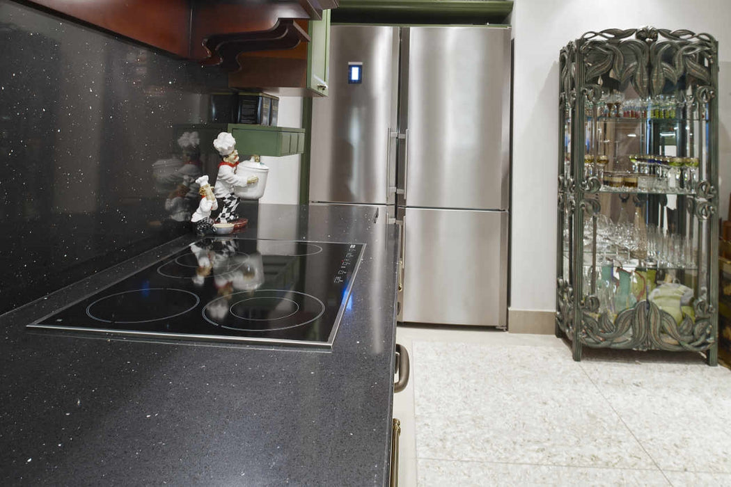 Quartzul compozit negru, cu o suprafață lucioasă și cristale de oglindă inserate, este alegerea perfectă pentru spații sofisticate și durabile. Oferă un design modern și o rezistență excepțională, fiind ideal pentru multiple aplicații.