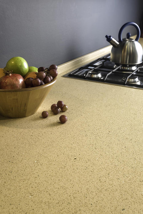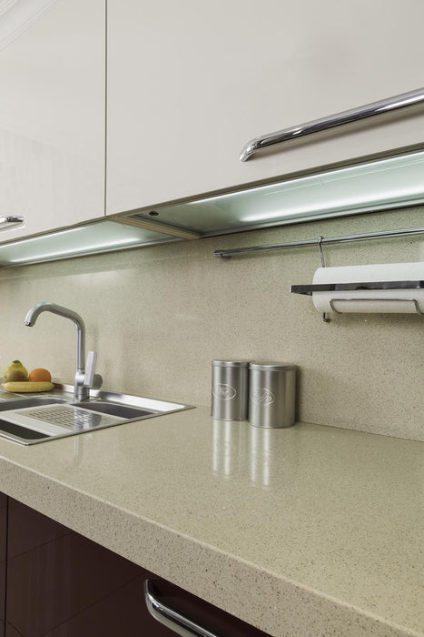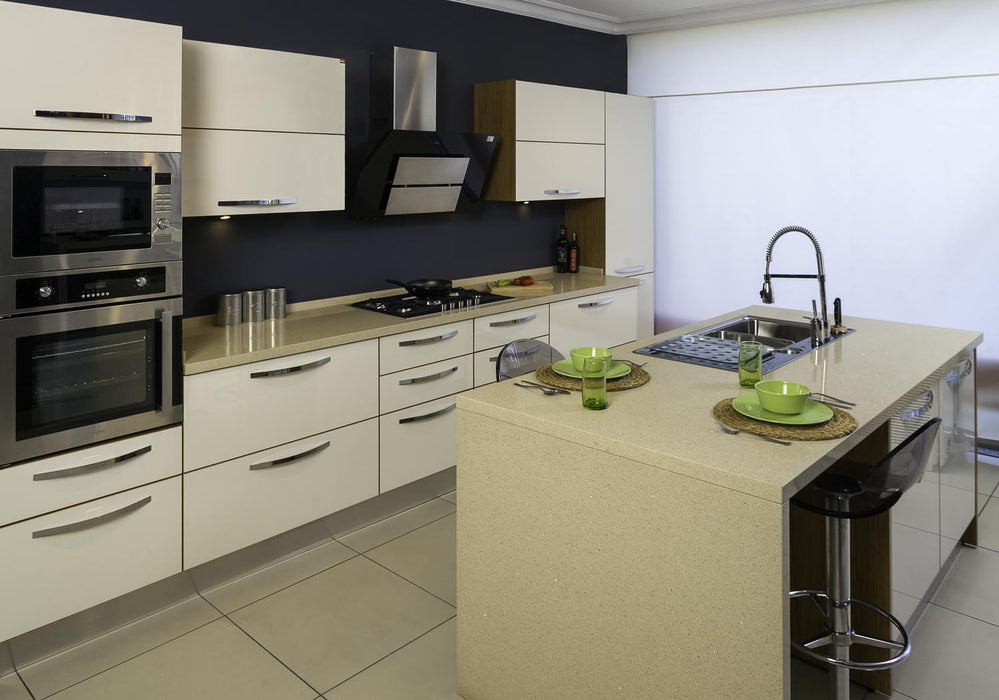 SINES este un quartz compozit elegant, de culoare beige, cu inserții de cristale fine și un finisaj lucios, ce adaugă un plus de rafinament oricărui spațiu. Acest material versatil este ideal pentru fabricarea de produse personalizate, combinând perfect estetica și funcționalitatea.