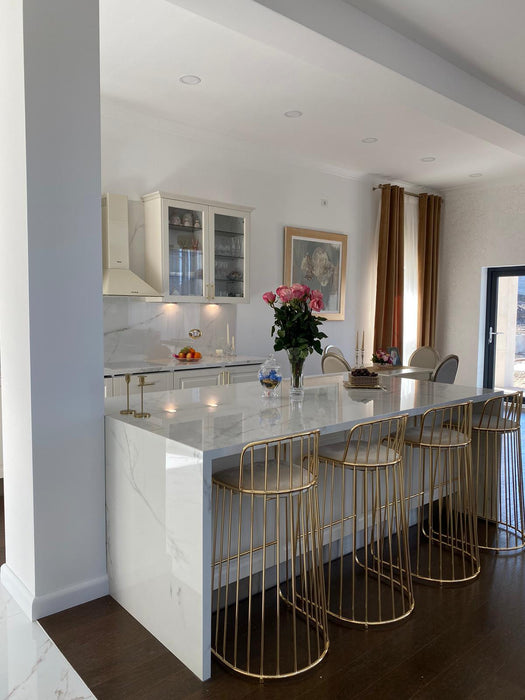 Realizate din ceramică porțelanată de înaltă calitate, importată din Italia, blaturile CALACATTA ORO se remarcă printr-un design elegant, cu o suprafață în tonuri de alb-ivory, străbătută de vene delicate în nuanțe auriu-maroniu. Disponibile în două finisaje rafinate – Lucios și Mat (natural).