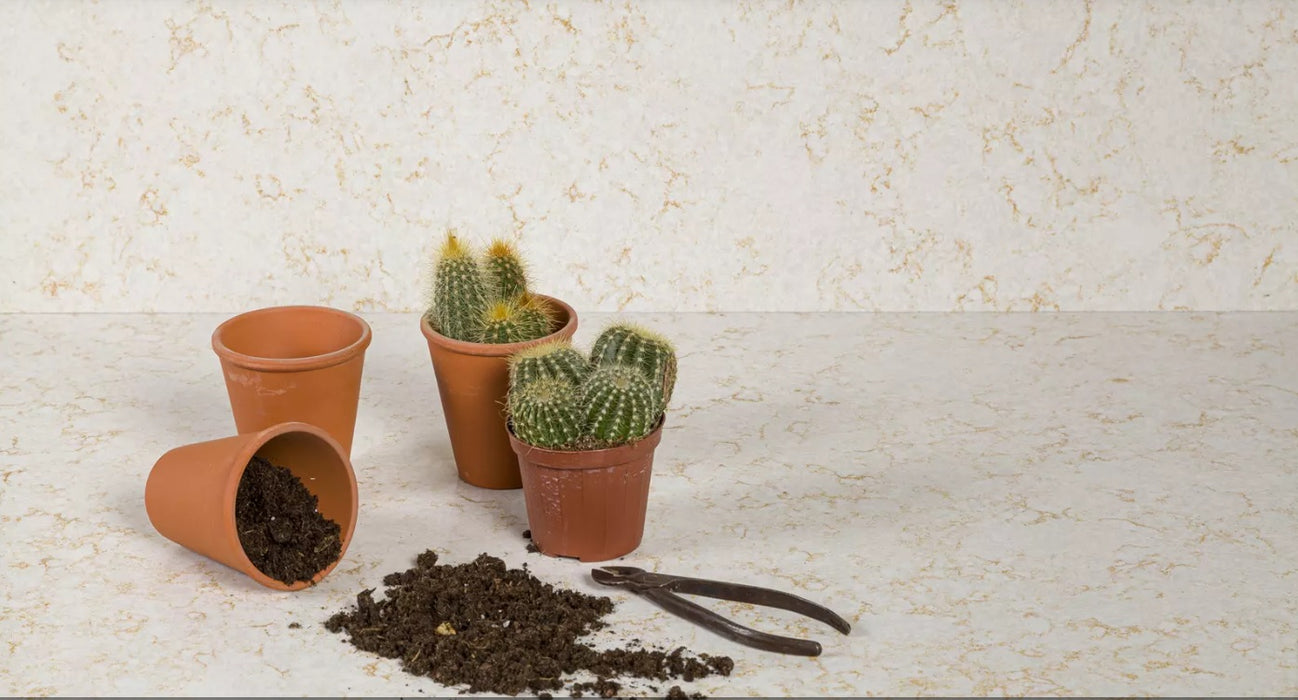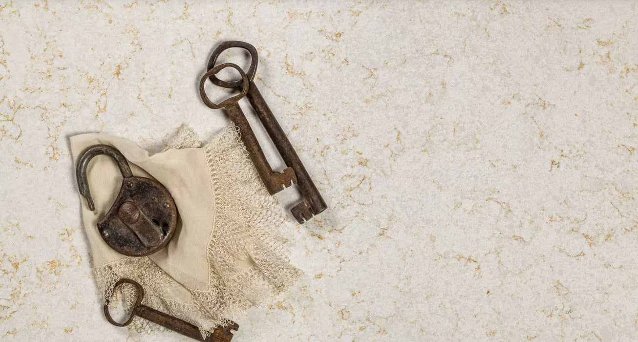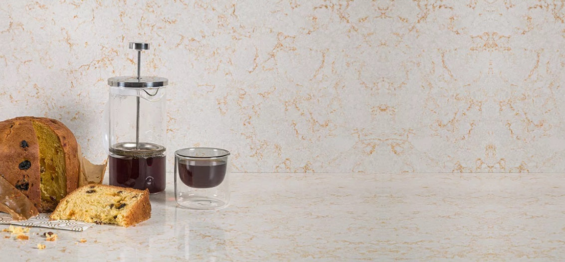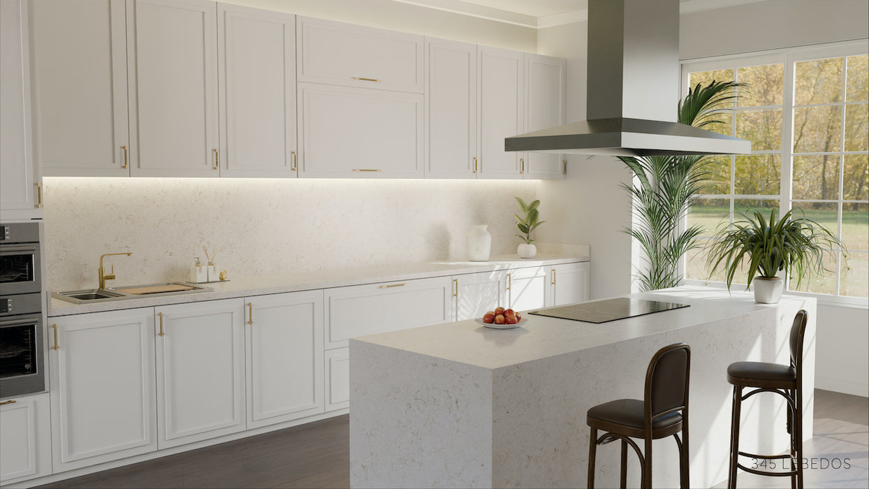 Lebedos 345 de la Cimstone este un quartz compozit premium, cu suprafață alb-gălbuie și venatură accentuată crem-beige, având un aspect puternic marmorat.