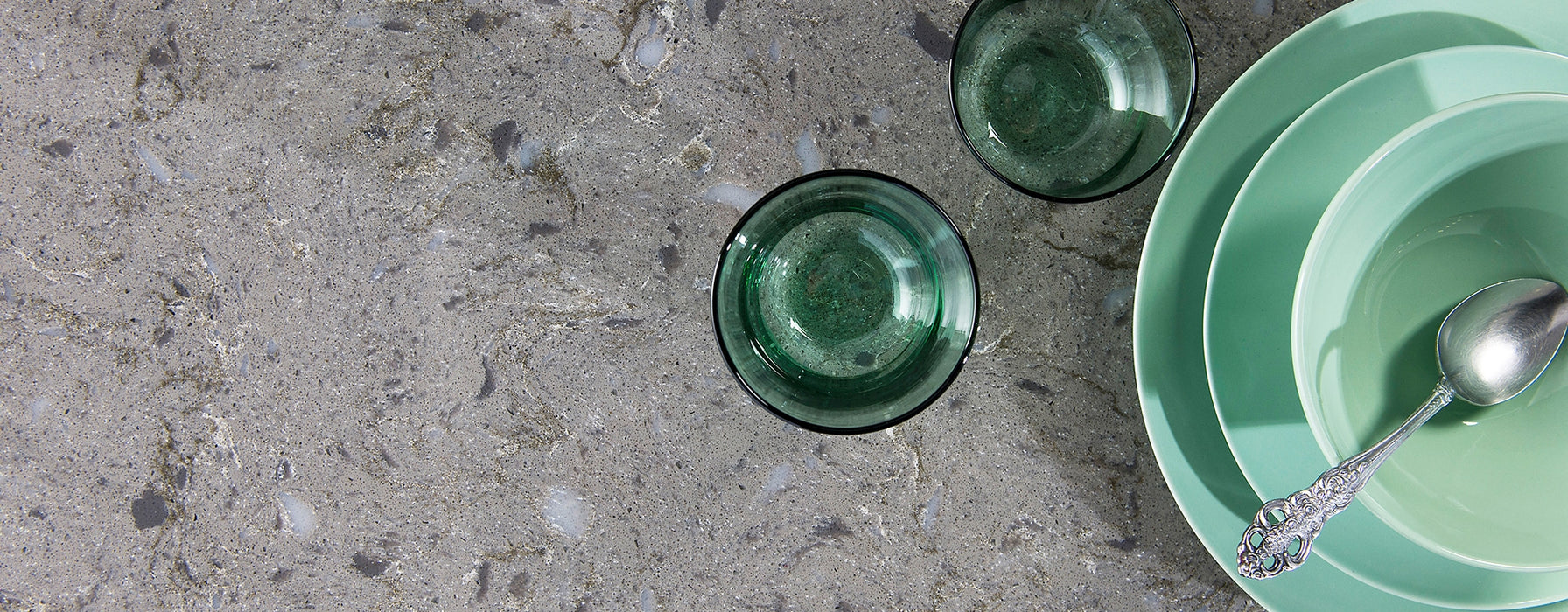 NEMESIS este un quartz compozit cu aspect de granit, de culoare antracit ciment, având o suprafață lucioasă impregnată cu microcristale de oglindă pentru un efect vizual sofisticat.